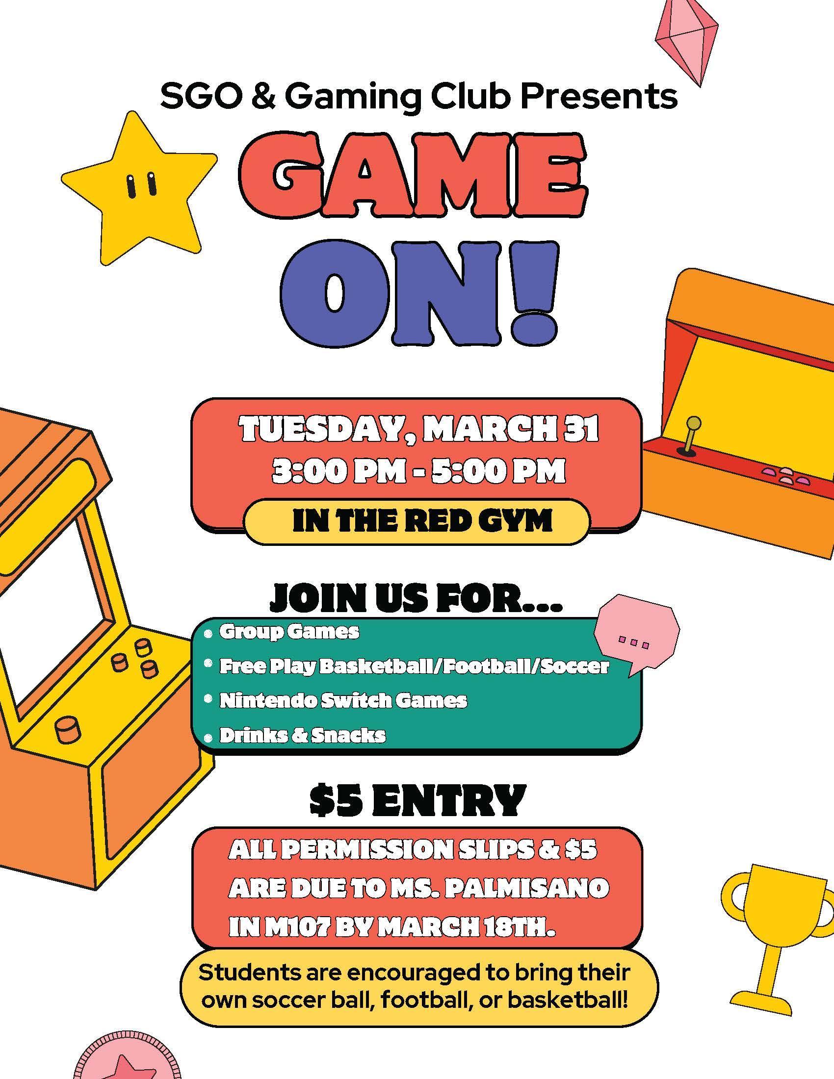 Game On! – SGO & Gaming Club Event The SMS SGO & Gaming Club are excited to host “Game On!” on Tuesday, March 31 from 3:00–5:00 PM in the Red Gym. Students will have the opportunity to participate in group games, enjoy free play basketball, football, and soccer, play Nintendo Switch games, and enjoy drinks and snacks. The cost to attend is $5, and a completed permission slip is required. Please review the attached flyer and permission form for full event details, eligibility requirements, and submission deadlines. We look forward to a great afternoon of fun and school spirit. Attached Files March26event.pdf Print