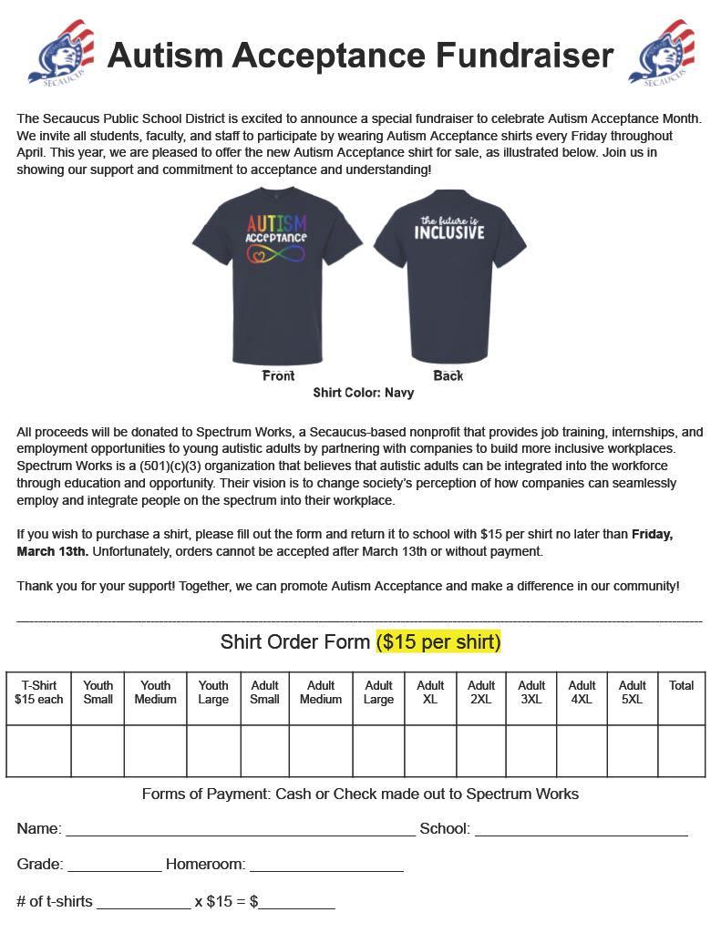 Autism Acceptance Fundraiser Autism Acceptance Fundraiser April 2026 Wear your Autism Acceptance shirt every Friday in April to show your support for acceptance and understanding! $15 per shirt • Navy Blue Youth S–L | Adult S–5XL Order by Friday, March 13th Cash or check made out to Spectrum Works • No late orders accepted All proceeds go to Spectrum Works, a Secaucus-based nonprofit providing job training & employment for young autistic adults. Attached Files April 2026 is Autism Acceptance Month.pdf Print